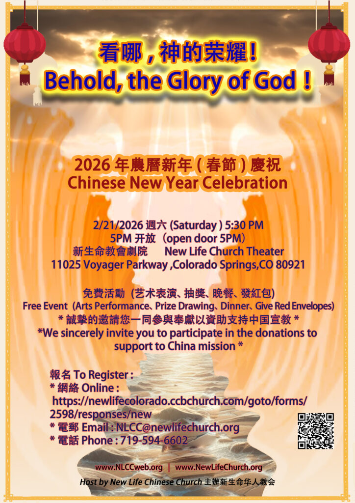 Join us for dinner, entertainment, and a prize drawing at our Chinese New Year Celebration, “Behold, the Glory of God!” We will participate in donations to fund Chinese orphanages and house churches.